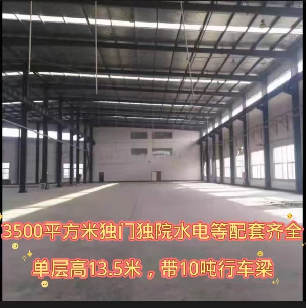 面积2600平和7600平独门独院,高13.8米,10吨行车。独门独院,水、电、气、证件齐全,独立办公区域。交通便利,停车方便。欢迎入驻!适合大中型物流集聚地、加工企业等多种经营。具体面议。